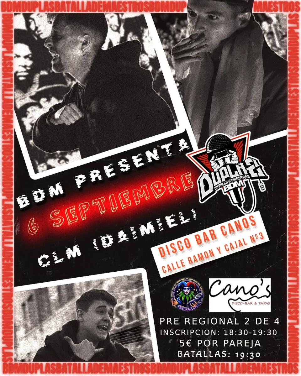 🔥Segunda PRE-REGIONAL de BDM DUPLAS 2K25 en Castilla La Mancha (DAIMIEL)🔥 🏆 *Premio* Las 4 primeras parejas clasifican a la Regional en Ciudad Real 📍 *Ubicacion* Disco bar Canos Calle ramon y cajal Número 3 🕔 *Hora* 18:30-19:30 🎤 *Batallas* 19:30 🏷 *Precio* 5€ @Discobarcanos2022 @freerapclm #BDMDUPLAS2K25 #BDMGOLDESPANA #CLM #CASTILLALAMANCHA #batallasderap #batallasdefreestyle