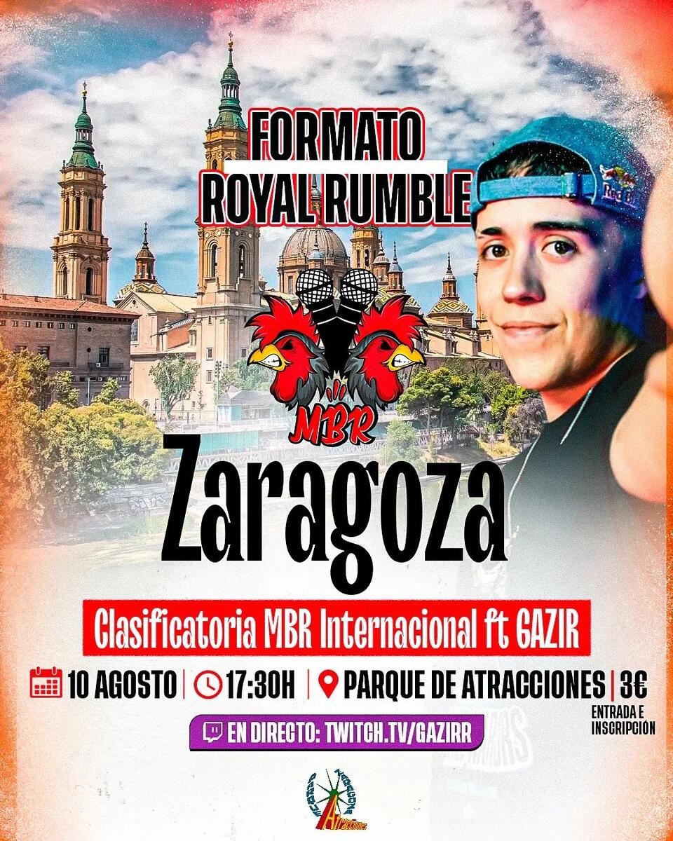 CLASIFICATORIA A LA FINAL INTERNACIONAL DE MIRAELBUENRAP FT @gazir_ysb El sábado 10 de Agosto tendremos un evento en el parque de atracciones de Zaragoza formato Royal Rumble 🔥 Entrada o Inscripción: 3€ El cupo para la internacional saldrá de una batalla individual entre el mc que pase más rondas y el campeón del royal rumble (en caso de ser la misma persona clasificaría directamente) Premio: PUESTO EN LA INTERNACIONAL CON VIAJE Y ALOJAMIENTO PAGADO + 50% BOTE GENERADO CON LAS ENTRADAS E INSCRIPCIONES + LO GENERADO EN EL DIRECTO DE @gazir_ysb Podréis seguir todo el evento desde su canal de Twitch y posteriormente en nuestro canal con los videos oficiales 😱 Gracias @atraczara por la confianza y @gazir_ysb por apostar por el under aportando visibilidad ♥️ 🎨 @vecto.designs . . . #miraelbuenrap #gazir #batallas