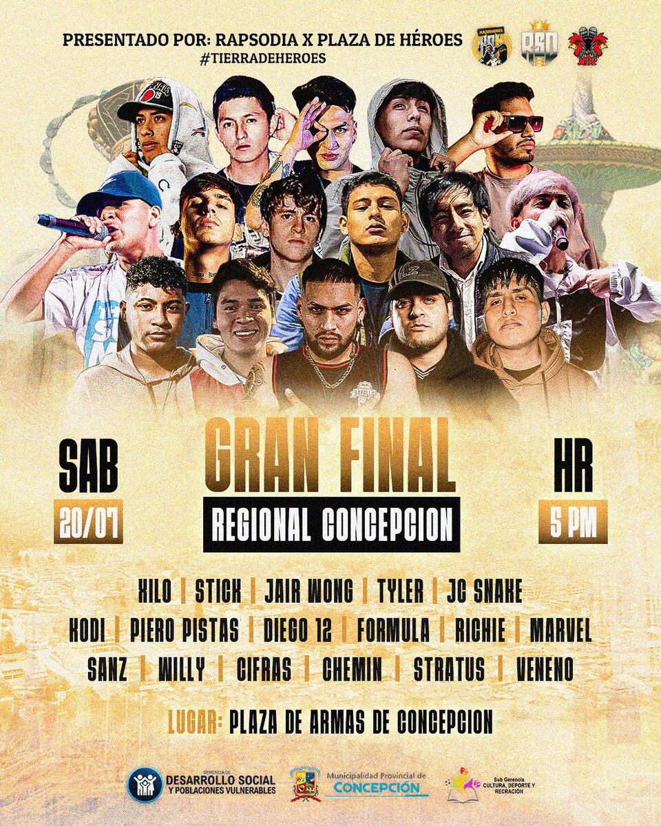 FINAL REGIONAL MBR CONCEPCIÓN 🔥 Concepción define a sus 04 clasificados para la Final Nacional @miraelbuenrap_peru Estarán en competencia: @xilo619 @stickrenteria @jairw17 @luis_urteaga AKA TYLER - @jc.snake @kod1_hyo @pieropistas @diego12free - @f0rmu1aaa @richie__nathan @marvelmtk #SANZ - @mc_willy_hyo @angel.cifras @cheminrap @stratus_lgv #VENENO +03 cupos en Última Oportunidad 📆 Fecha: Sábado 20 de Julio 📍 Lugar: Plaza de Armas - Concepcion (Junín) 🎫 Entrada libre para todo el público! 👀 No te pierdas de una tarde de grandes batallas, shows musicales, artistas invitados y mucho más! Agradecimiento especial a la Municipalidad de Concepción por hacer posible este evento.