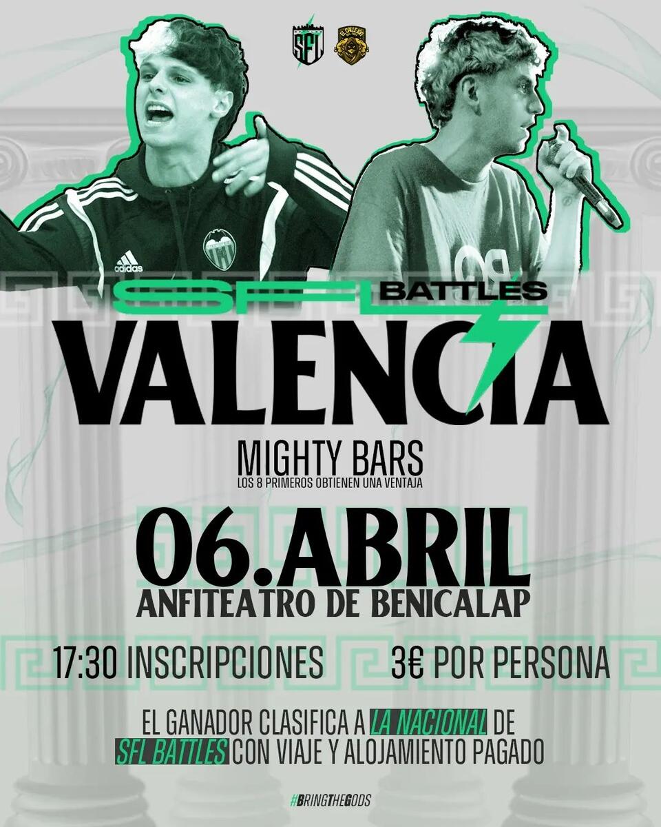 PRIMER PASO AL OLIMPO 🏛️ El público es soberano y ha decidido que tendremos clasificatoria. Y vamos con una de las nuevas caras de esta temporada, tendremos 3 regionales para la Nacional de SFL y cada una tendrá un formato distinto. En esta primera clasificatoria tendremos las Mighty Bars, dónde tras filtros, los 8 primeros tendrán una ventaja que podrán usar durante las eliminatorias, un formato parecido al implementado por nuestros colegas de @_noitemeiga_ en su Nacional 🤝🪄 🗓️ 6 de Abril ⌚ 17:30 📍 Anfiteatro de Benicalap 🪙 3€ 🏆 Viaje y alojamiento pagados a la Nacional de SFL Un viaje a Barcelona en juego el próximo sábado. NOS VEMOS EN UNA SEMANA FAMILIA 🔥