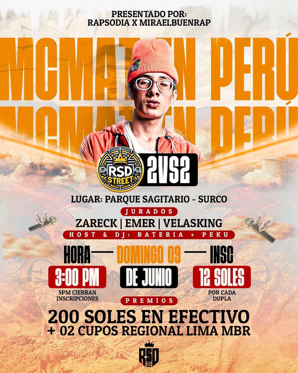 🎤🇨🇴 MCMAT POR PRIMERA VEZ EN PERÚ! Desde la tierra del café, por primera vez en Perú, llega @mcmat.youngcream , campeón actual de BDM Colombia. 📆 Este domingo 09 de Junio tenemos un 2vs2 con el que inauguramos @rapsodia.street, un nuevo espacio dedicado a los eventos en plazas callejeras. Esta vez visitando un nuevo espacio en el Parque Sagitario gracias a la @muni.surco rumbo a la Regional Lima de @miraelbuenrap_peru que enviará al campeón a representarnos a España 🇪🇸 🙅♂️ JURADOS: ▪️ @zareck_bm ▪️ @velasco.rf ▪️ @emer_sano 🎤 HOST @bateria.oficial_ & DJ @pekubeats_pdr 📍LUGAR: ▪️ Anfiteatro del Parque Sagitario - Surco 🎁 PREMIOS ▪️ 200 soles en efectivo ▪️ 02 cupos a la Regional @miraelbuenrap_peru Rumbo 🇪🇸 ⚠️ Las inscripciones estarán abiertas desde las 3:00 PM y tendrán un costo de 12 soles por dupla. Sin embargo, los que sigan las páginas de @miraelbuenrap_peru y @rapsodia.street y compartan el flyer, pagarán en total 10 soles por dupla (ambos freestylers deben hacerlo) 🙌 Agradecemos @muni_surco por el apoyo y el espacio para desarrollar nuestro arte. 👀 Será un fechón con micros, fotos, batallas grabadas y muchas sorpresas. No te lo puedes perder! 🎨: @tek_dg