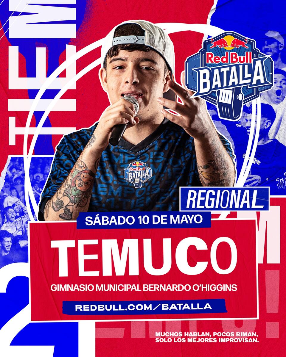 Primera parada de @RedBullCl: #Temuco 🇨🇱🎤 - Este sábado 10 de mayo transmitiremos en nuestros canales de Twitch, Facebook, X, TikTok y Youtube la Regional Temuco de #RedBullBatalla 2025 - 🎟️ La entrada al Gimnasio Municipal Bernardo O'Higgins será libre y gratuita con aforo limitado - Compiten: - @Lilbo0._ A.K.A. Mr Bean @Mzeta.Thno @_.Chiki.333._ @IsNastyNine A.K.A. 99 - @Nazion_ @Deafc__ @Nashosku A.K.A. Stereo @Camikaze.11 - @Draker.Ego @Erreka.Ego @JaimitoOne_ @Anubbbis - @Yerko_Noreck @Maniak.Ego @VerseoJr @Racso_Oficial - @202.Wise @Citovy @Bigtaminaa @Askel.Sf - @Esezeta._ @Leeeoo0._ @Balas.Lv @Berrun._ - Mira la Regional Temuco de @RedBullCl este sábado 10 de mayo en todos nuestros canales a partir de las 16:00 hora chilena - #HipHop #Rap #RedBull #Freestyle #2025 #Chile #Temuco